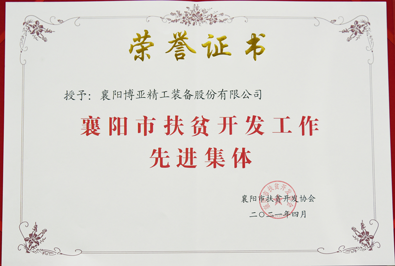 4月15日,襄陽市扶貧開發(fā)協(xié)會一屆五次理事會議在襄陽名人酒店召開。會上對全市扶貧開發(fā)工作先進集體和先進個人進行了表彰。博亞公司因多年來在全市精準扶貧和公益捐助等方面做出的積極貢獻而被授予“襄陽市扶貧開發(fā)工作先進集體”稱號,并獲頒證書和獎牌。
